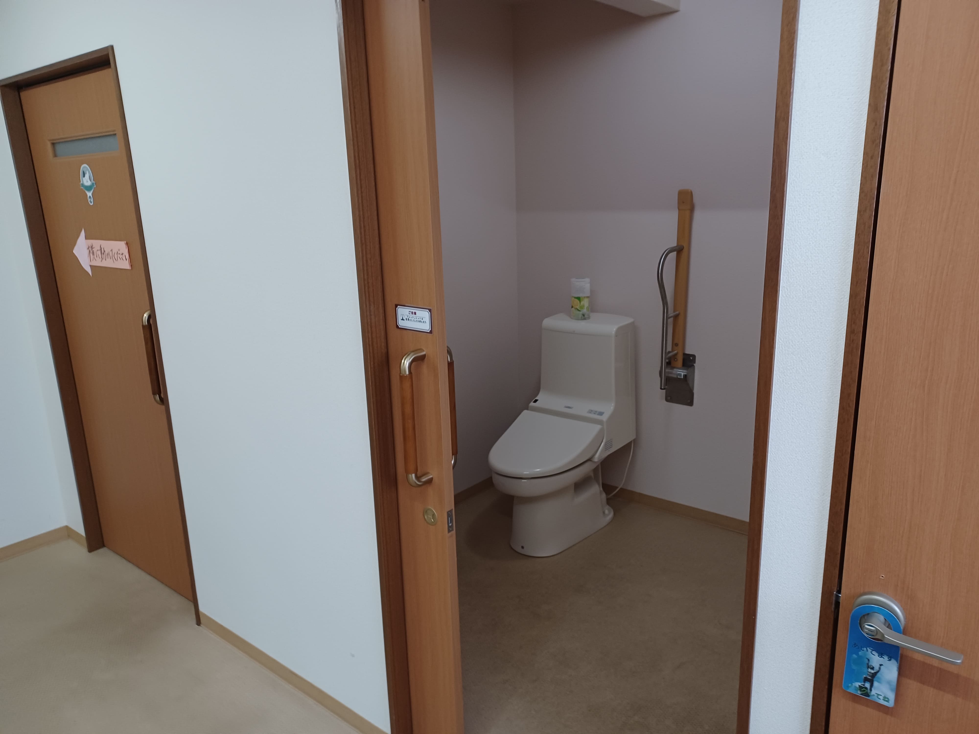 バリアフリーで車いす対応のトイレを2ケ所 完備してあります。別に男性用のトイレもあります。