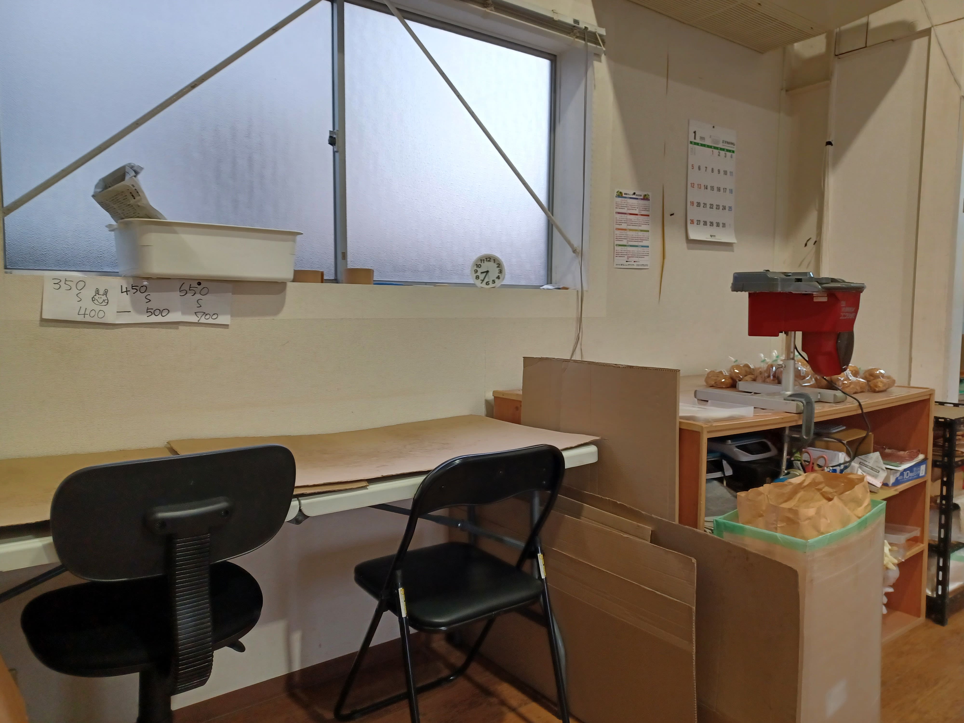 野菜の計量・袋詰めをおこないます。計量・袋詰めの担当とバッグシーラー(シールで封をする機械)を使い封をする担当に 分かれて作業をおこないます。 また、シール貼りやファイルの留め具を作る作業をするスペースもあります。